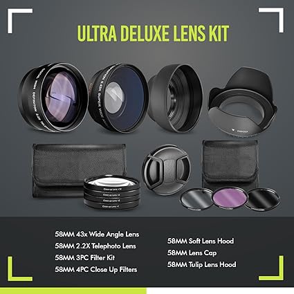 - Comprehensive Gear – This 58mm lens kit for Canon EF-S 18-55mm IS II STM is a comprehensive equipment set essential for photographers. It bundles a vast array of professional tools into one convenient package, including 43x Wide Angle Lens, 2.2X Telephoto Lens, 3pc Filter Kit, 4pc Close Up Filters, Tulip Lens Hood, Soft Lens Hood, Lens Cap, and Cap Keeper.